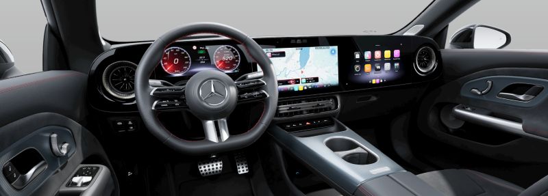 Sada na opravu pneumatik TIREFIT, Akustická výstraha pro okolí, Automatický restart při popojíždění v dopravní zácpě, Asistent přizpůsobení rychlosti, Asistent udržování odstupu DISTRONIC, Aktivní asistent rychlostního omezení Speed Limit Assist, Asistent hlídání mrtvého úhlu, Asistent udržování jízdního pruhu, Asistent dopravního značení, Upozornění na překročení rychlostního limitu, Brzdový asistent, Funkce nouzového zastavení, Asistent pro podporu vyhýbacího manévru, Varování při vystupování, Asistent manévrování, Multifunkční volant potažený kůží, Sada komfortních funkcí zrcátek, Čidlo pro rozpoznání dětské sedačky na sedadle spolujezdce vpředu, Velurové koberečky, Bederní opěrky nastavitelné 4 směry, Kolenní airbag řidiče, Středový airbag, Navigace MBUX, Panoramatická pevná střecha, Komfortní podvozek, Digitální přijímač rozhlasového vysílání DAB, Tepelné čerpadlo, Ozdobné výplně interiéru ve vzhledu antracitového eloxovaného kovu, Nabíjecí systém 800 V DC, Palubní nabíječka 11 kW AC, Nabíjecí kabel do 11 kW pro wallboxy a veřejné nabíjecí stanice (5 m), Ozdobné výplně interiéru ze světlého hliníku s dekorem karbonové struktury